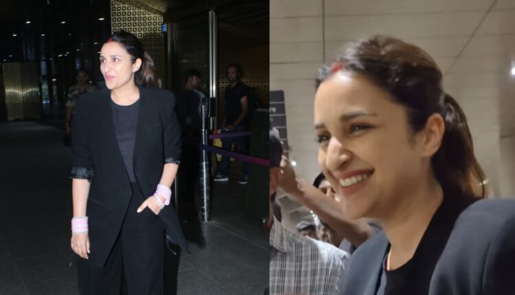 परिणीति चोपड़ा का मुंबई एयरपोर्ट पर ब्लैक कलर की पैंट और उसी रंग का कोट पहने मुंबई एयरपोर्ट पर स्पॉट हुईं. इसके साथ ही एक्ट्रेस ने कोट के अंदर ब्लैक कलर की टी-शर्ट पहनी. अपने लुक को पूरा करने के लिए एक्ट्रेस पिंक कलर का चूड़ा, माथे पर सिंदूर और बालों को बांधकर पोनी की हुई हैं.