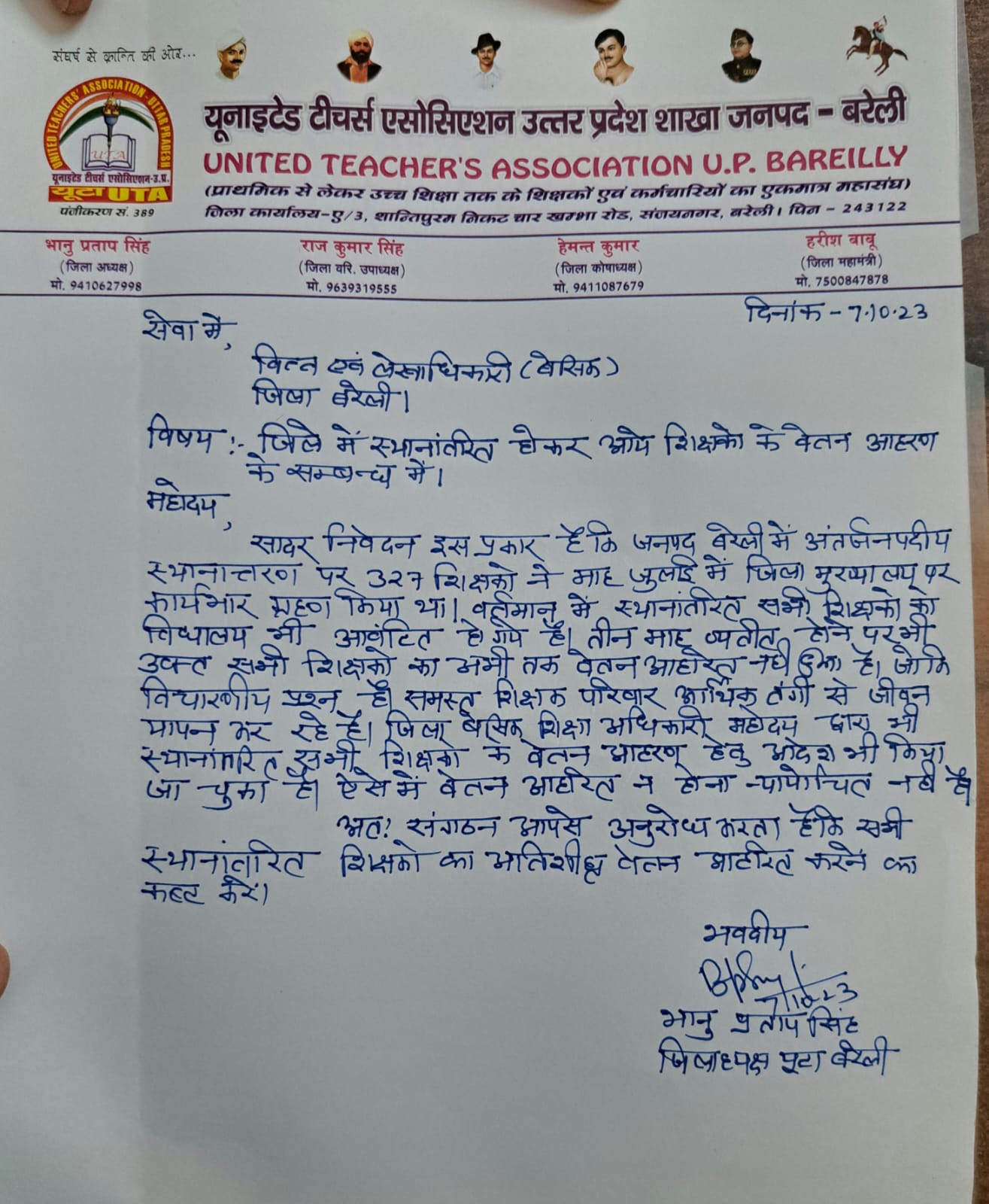 बरेली। अन्य जनपदों से आए 327 शिक्षकों का बीते तीन माह से वेतन नहीं मिल पाया है जिसके संबंध में यूटा जिलाध्यक्ष भानु प्रताप सिंह के नेतृत्व में यूटा पदाधिकारियों ने आज लेखा अधिकारी को ज्ञापन सौंपा। जिसमें यूटा जिला अध्यक्ष भानु प्रताप सिंह ने बताया जुलाई माह में 327 शिक्षक स्थानांतरित होकर आए थे जिनका कि गत माह में विद्यालय आवंटन भी हो चुका है और बीएसए बरेली द्वारा इन सभी शिक्षकों के वेतन निर्गत करने का भी आदेश जारी हो चुका है। किंतु तीन माह होने पर अभी तक इनका वेतन निर्गत नहीं हुआ है जो कि विचारणीय प्रश्न है जिससे शिक्षक आर्थिक तंगी से गुजर रहे हैं और जीवन यापन करने में भारी कठिनाई का सामना करना पड़ रहा है। ऐसे में यूटा ने मांग की है कि समय रहते सभी शिक्षकों का वेतन ससमय निर्गत किया जाए। संबंधित पटल सहायकों ने बताया कि ब्लॉक से अभी तक पत्रावलिया भी लेखाधिकारी कार्यालय नहीं पहुंची है जैसे ही पत्रावलियां पहुंच जाएगी वेतन आहरण का कार्य शुरू कर दिया जाएगा। ज्ञापन देने वालों में जिला महामंत्री हरीश कुमार, कोषाध्यक्ष हेमंत कुमार जिला वरिष्ठ उपाध्यक्ष राज पल्याल, उपाध्यक्ष सत्येंद्र पाल सिंह, रवि कुमार,राजेश कुमार ,देवराज भारती, आलमपुर ब्लॉक अध्यक्ष अरविंद गुर्जर, प्रदीप यादव, पुष्पेंद्र कुमार, रमेश मौर्य, हेमंत मौर्य, सुनील कोली इत्यादि मौजूद रहे।