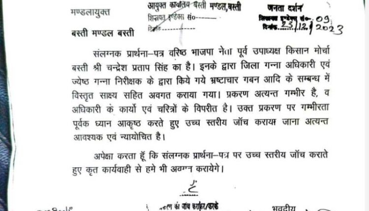 बस्ती: भारतीय जनता पार्टी किसान मोर्चा के पूर्व जिला उपाध्यक्ष चन्द्रेश प्रताप सिंह ने मुख्यमंत्री को पत्र भेजकर कहा है कि जिला गन्ना अधिकारी एवं गन्ना विभाग में कार्यरत ज्येष्ठ गन्ना विकास निरीक्षक अमरनाथ दूबे द्वारा व्यापक भ्रष्टाचार किया जा रहा है और गाड़ी संख्या यूपी 51 ए बी 5097 जो मोटर साइकिल हीरो का नम्बर है और कौशल किशोर के नाम से पंजीकृत है, उससे अवैध रूप से भुगतान प्राप्त किया गया है।