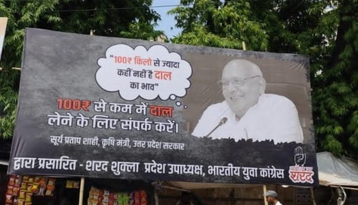 दरअसल, इन दिनों कृषि मंत्री सूर्य प्रताप शाही का 100 रुपये किलो की दाल वाला बयान चर्चा में बना हुआ है। अखिलेश यादव के बाद कांग्रेस भी हमलावर है। प्रदेश युवा कांग्रेस के उपाध्यक्ष शरद शुक्ला ने कांग्रेस कार्यालय के बाहर एक होर्डिंग लगवाई, जिसमें लिखा है- ₹100 से कम में दाल लेने के लिए कृषि मंत्री सूर्य प्रताप शाही से संपर्क करें।