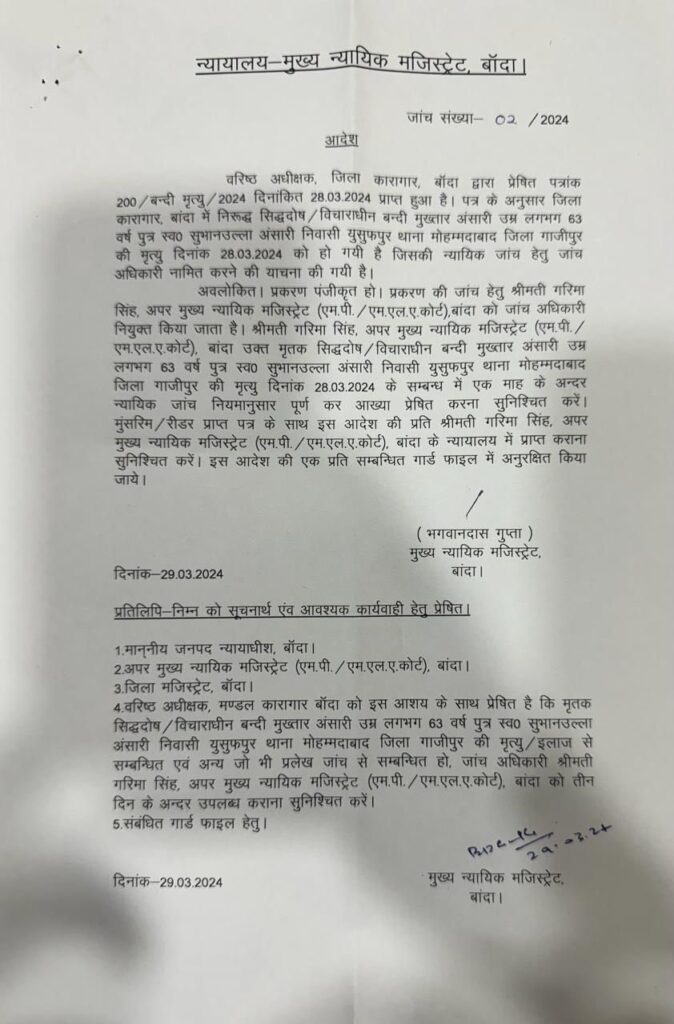 लखनऊ: माफिया मुख्तार अंसारी की मौत की न्यायिक जांच की जाएगी। अपर मुख्य न्यायिक मजिस्ट्रेड गरिमा सिंह एमएपी-एमएलए कोर्ट बांदा को जांच अधिकारी बनाया है। जांच की रिपोर्ट एक महीने में देने का आदेश दिया गया है। मुख्तार की बृहस्पतिवार रात दिल का दौरा पड़ने से मौत हो गई थी जिसके बाद से ही सपा अध्यक्ष अखिलेश यादव व पूर्व आईपीएस अमिताभ ठाकुर ने मामले की न्यायिक जांच कराने की मांग की थी।