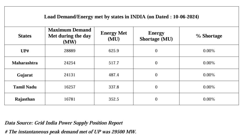 वहीं ग्रिड इंडिया पॉवर सप्लाई रिपोर्ट के मुताबिक 10 जून 2024 को एक बार फिर से उत्तर प्रदेश ने देश में सर्वाधिक 28889 मेगावाट विद्युत आपूर्ति कर महाराष्ट्र-गुजरात जैसे राज्यों को पीछे छोड़ते हुए पहला स्थान हासिल किया है।